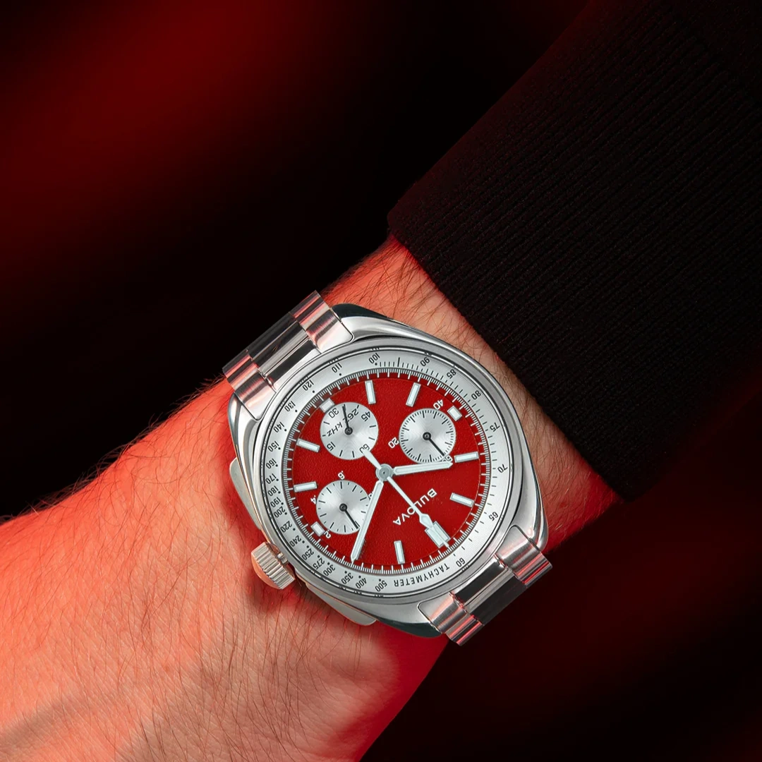 Striking red and silver “panda” dial for a bold aesthetic
