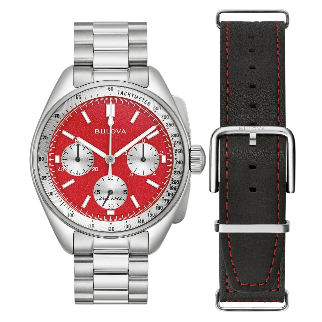 The Bulova 96K115 Lunar Pilot from the Archive Series is a heritage-inspired chronograph celebrating Bulova’s historic moon mission legacy. The 43.5 mm silver-tone 316L stainless steel case features polished finishes and slim chronograph pushers, paired with a crown showcasing the Bulova tuning fork logo. The dial stands out in a striking red and silver “panda” style, inspired by the color of a total lunar eclipse or “blood moon,” accented by a silver-white tachymeter ring and retro Bulova logo. Luminous hands and markers ensure excellent legibility even in low light, while the recessed, circular sub-dials provide detailed chronograph functionality.