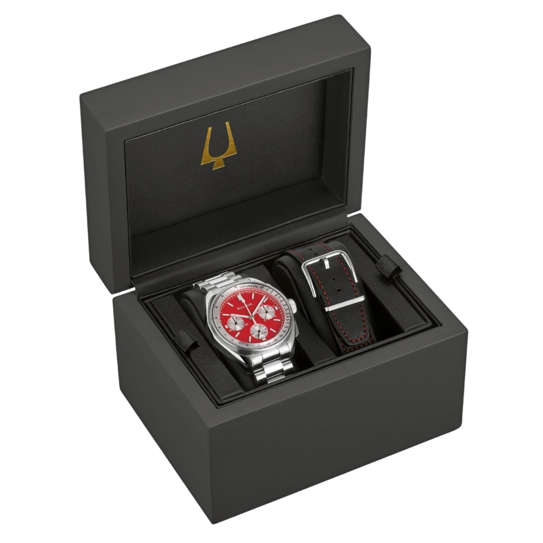 Powered by Bulova’s proprietary high-performance quartz movement (HPQ NP20, 262kHz), the watch delivers extreme accuracy with a sweeping chronograph hand. The 6-hand chronograph features a 1/20 second counter at 3 o’clock, running seconds at 6 o’clock, and a 60-minute chronograph counter at 9 o’clock.