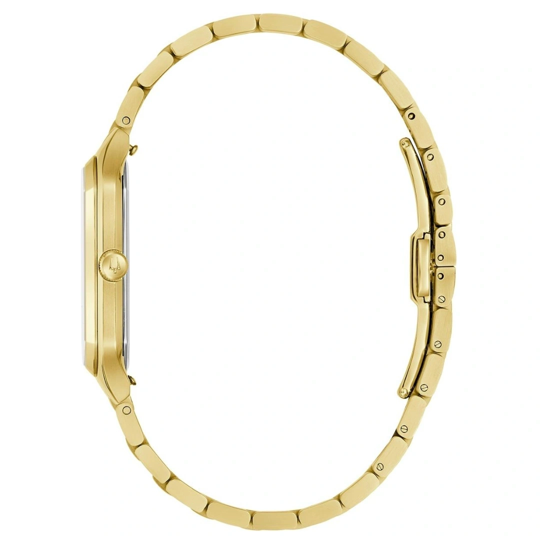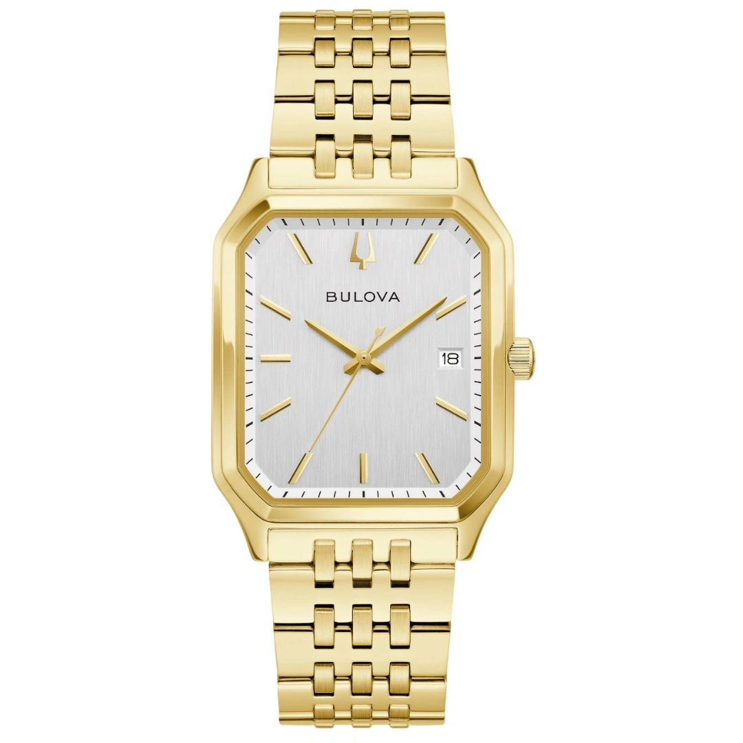 The Bulova 97B236 “We Are All Here” Tony Bennett Edition is a tribute timepiece honoring the legendary crooner. Inspired by 1980s designs, the watch features a gold-tone stainless steel case with sleek, angular lines and polished faceting, paired with a matching gold-tone stainless steel bracelet. The vertically brushed silver-tone dial is accented with gold-tone hands and markers, while the seconds hand features a counterbalance shaped like Tony Bennett’s signature folded pocket square. The case back proudly displays Bennett’s signature, making this edition a collectible for fans and watch enthusiasts alike.