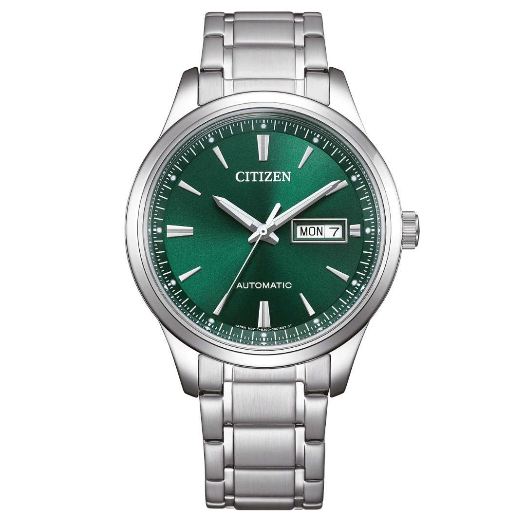 The Citizen NY4058-79XC is a 40mm men’s mechanical watch that blends classic design with reliable functionality. Featuring a polished stainless steel case and bracelet with a secure double push buckle, this timepiece showcases a green dial with stroke-style hour markers under crystal glass, giving it a refined and versatile look suitable for daily wear.