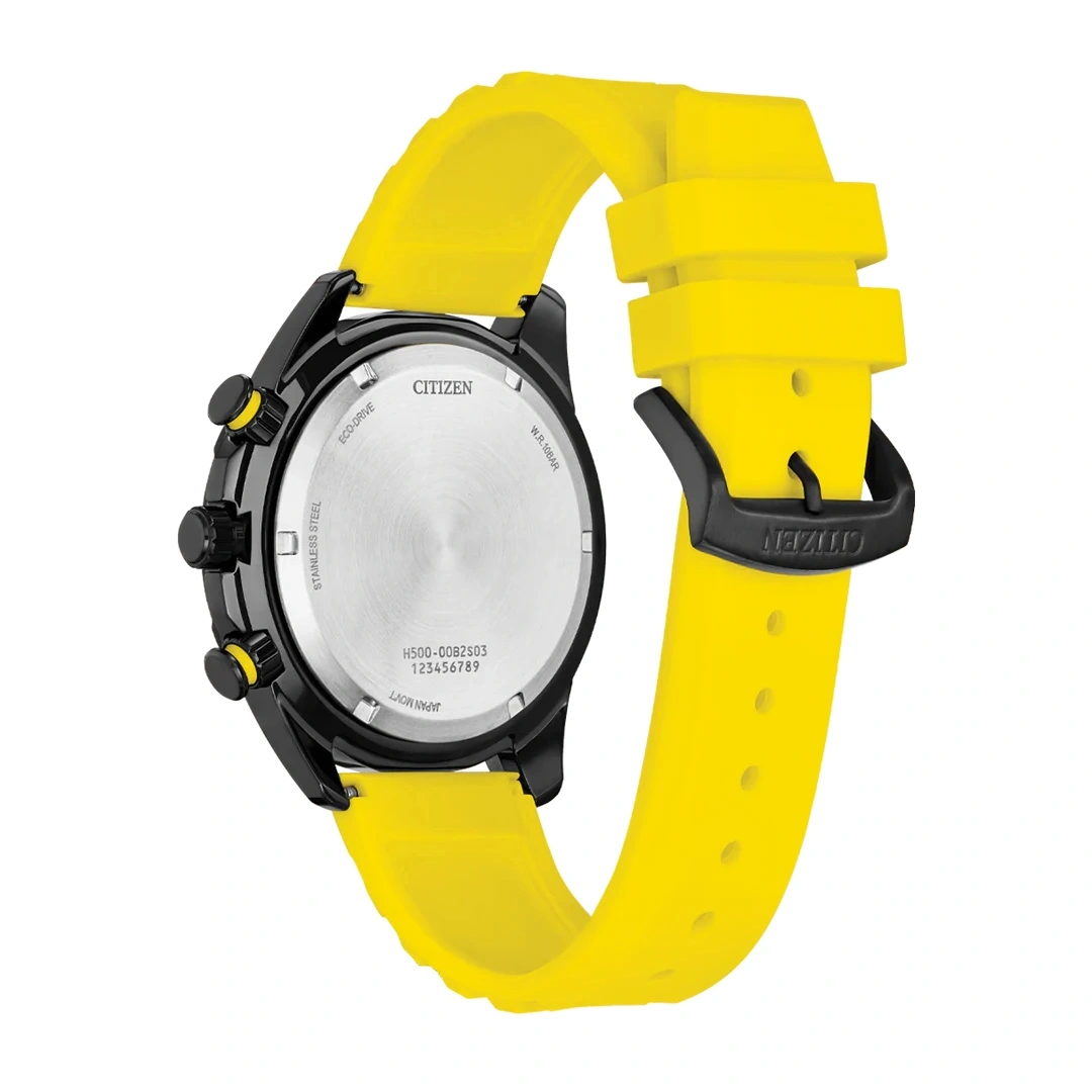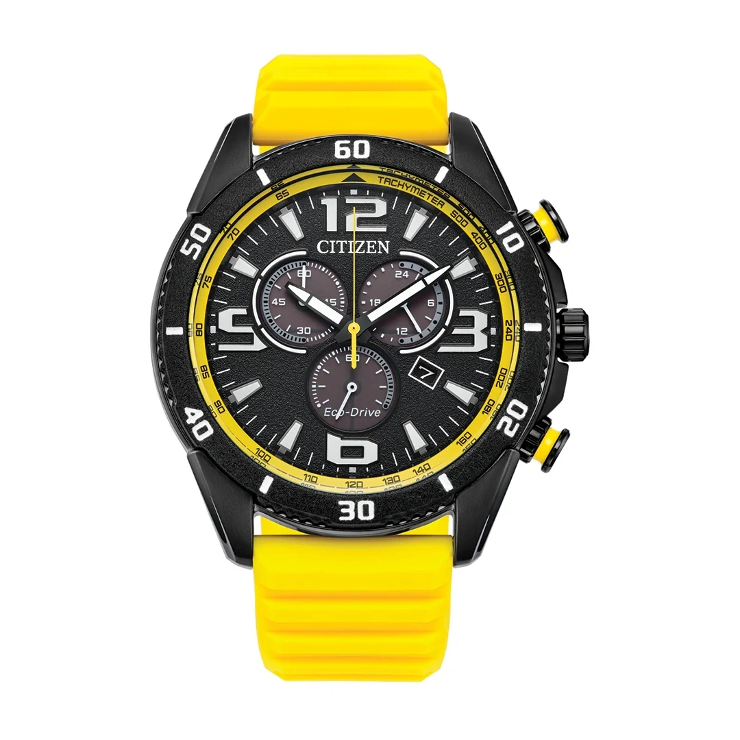 The Citizen AT2585-08E is a bold sport chronograph designed for performance and everyday versatility. It features a 44.9 mm black-tone stainless steel case complemented by vibrant yellow accents and racing-inspired pushers, creating a striking and energetic look. The watch is equipped with a rotating 60-minute bezel and a durable yellow urethane strap that provides both comfort and sporty style. Its black dial includes luminous hour markers for enhanced visibility and a yellow tachymeter scale surrounding the display, giving the watch a dynamic motorsport-inspired aesthetic.