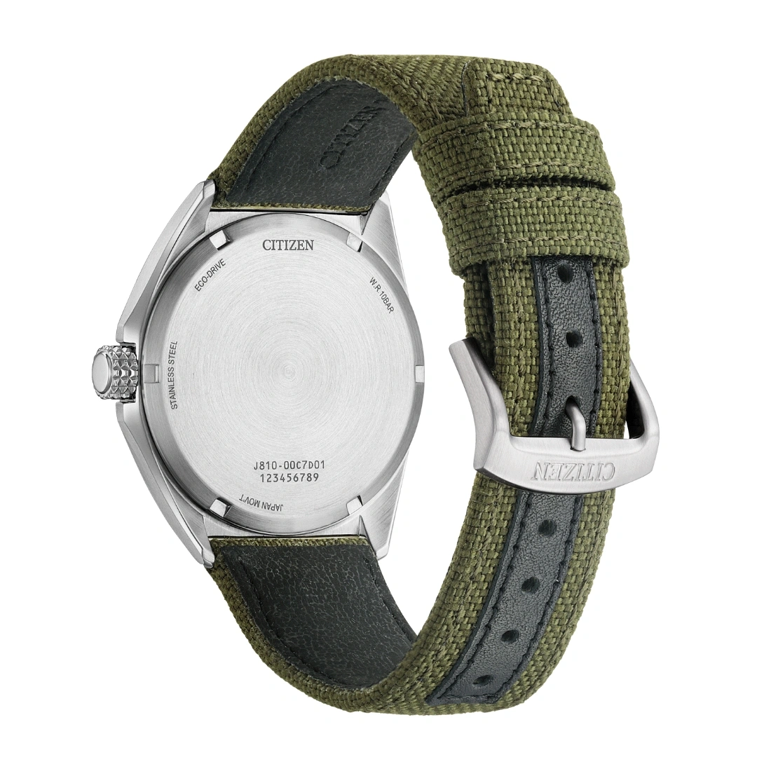 The Citizen AW1571-09A is a versatile Eco-Drive timepiece designed for everyday durability and comfort. It features a 40 mm stainless steel case with a slim 9 mm profile, giving the watch a clean and balanced look on the wrist. The white dial is equipped with Arabic numerals and stroke markers, ensuring excellent readability, while the crystal glass provides reliable protection for daily use. The lightweight design, paired with a green nylon strap, adds a sporty and casual style suitable for various occasions.