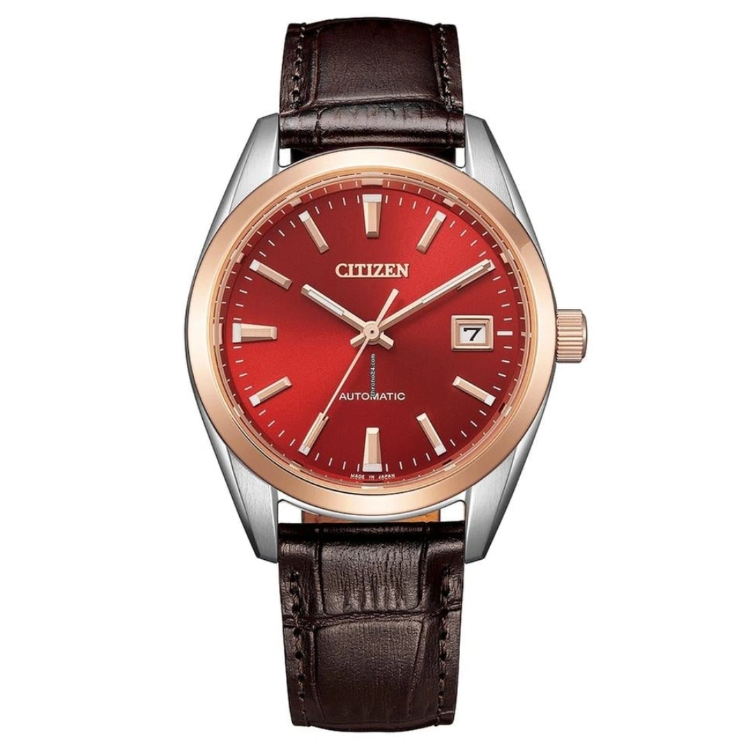 The Citizen Collection Automatic NB1055-04W is a stylish men’s watch that combines classic design with precise Japanese automatic movement. Featuring a 38 mm gold-plated stainless steel case paired with a brown calf leather strap, this watch offers both elegance and comfort. The red dial is accentuated by luminous hands and markers, providing excellent readability in low-light conditions, along with a practical date display.