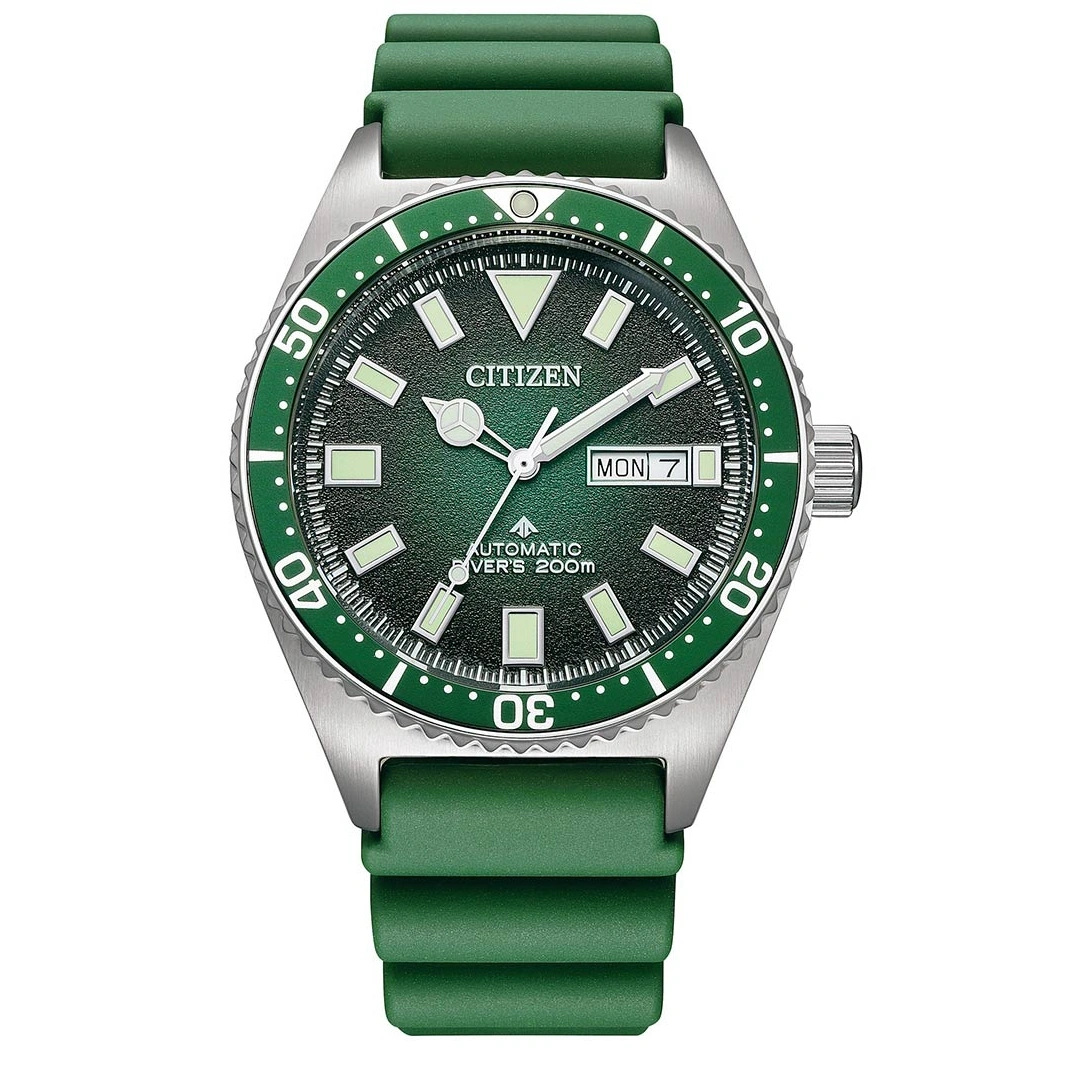 The Citizen NY0121-09XC is a 41mm mechanical diver’s watch from the PROMASTER series, built for durability and precision under demanding conditions. It features a stainless steel case with a rotatable bezel and a screw-down crown, paired with a green rubber (urethane) strap for secure underwater wear. The crystal glass ensures scratch resistance, while the ISO 6425 certification guarantees professional diving reliability.