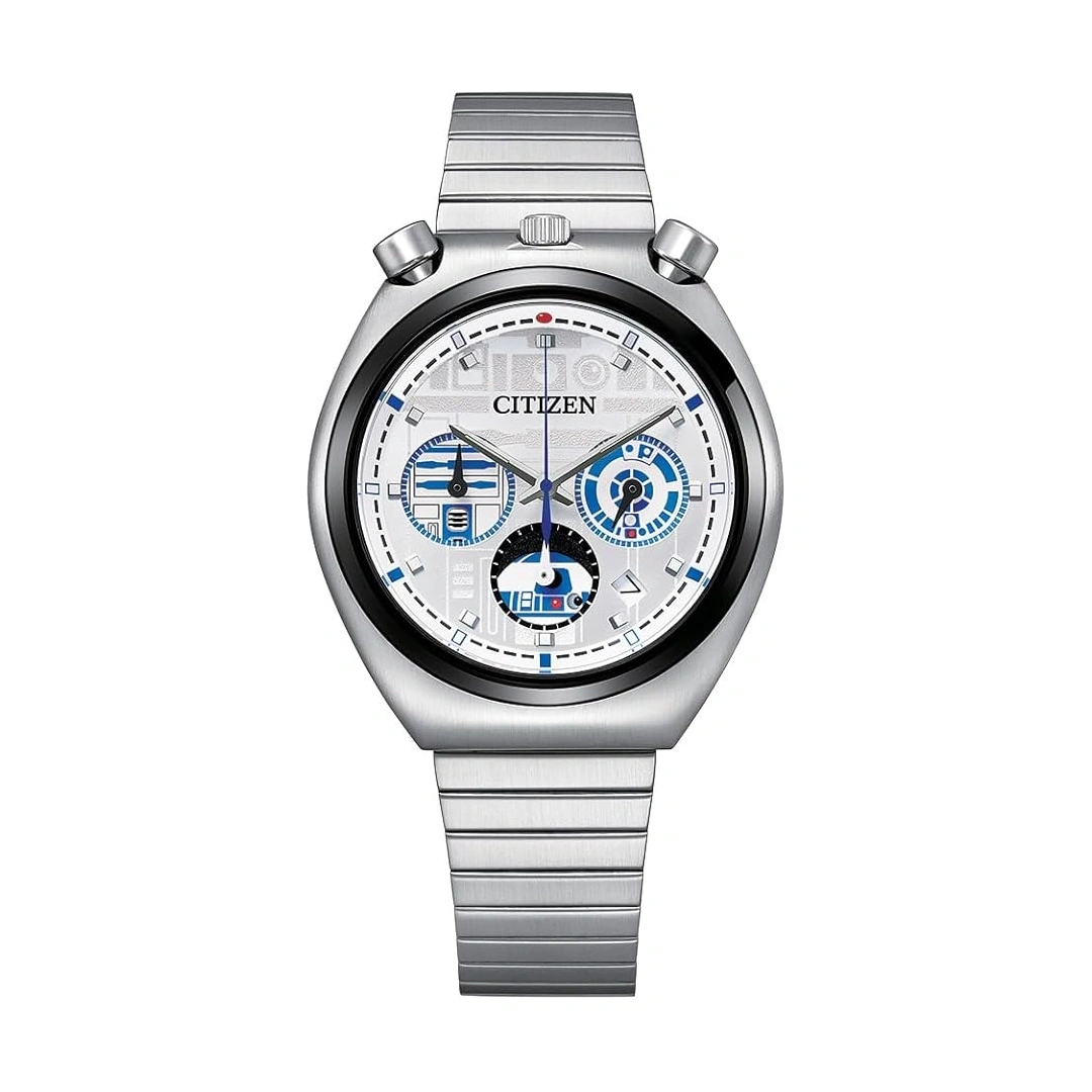 The Citizen AN3666-51A is a distinctive chronograph timepiece created as part of a special collaboration inspired by the beloved droid R2-D2 from the iconic Star Wars series. Designed with a 38 mm stainless steel case and matching steel bracelet, the watch presents a clean and versatile look with a silver dial that reflects the futuristic aesthetic associated with the legendary character. The design balances everyday wearability with subtle themed details that appeal to both watch collectors and Star Wars fans.