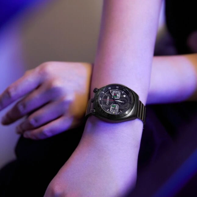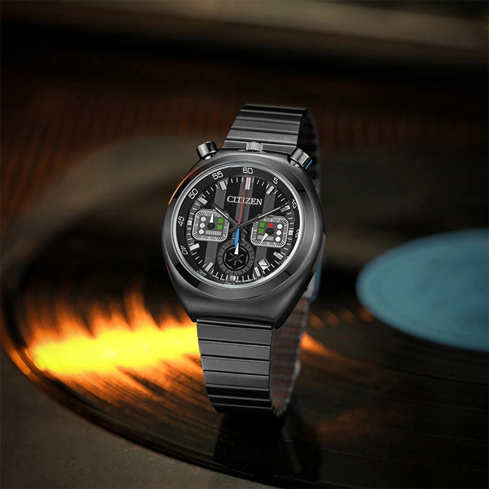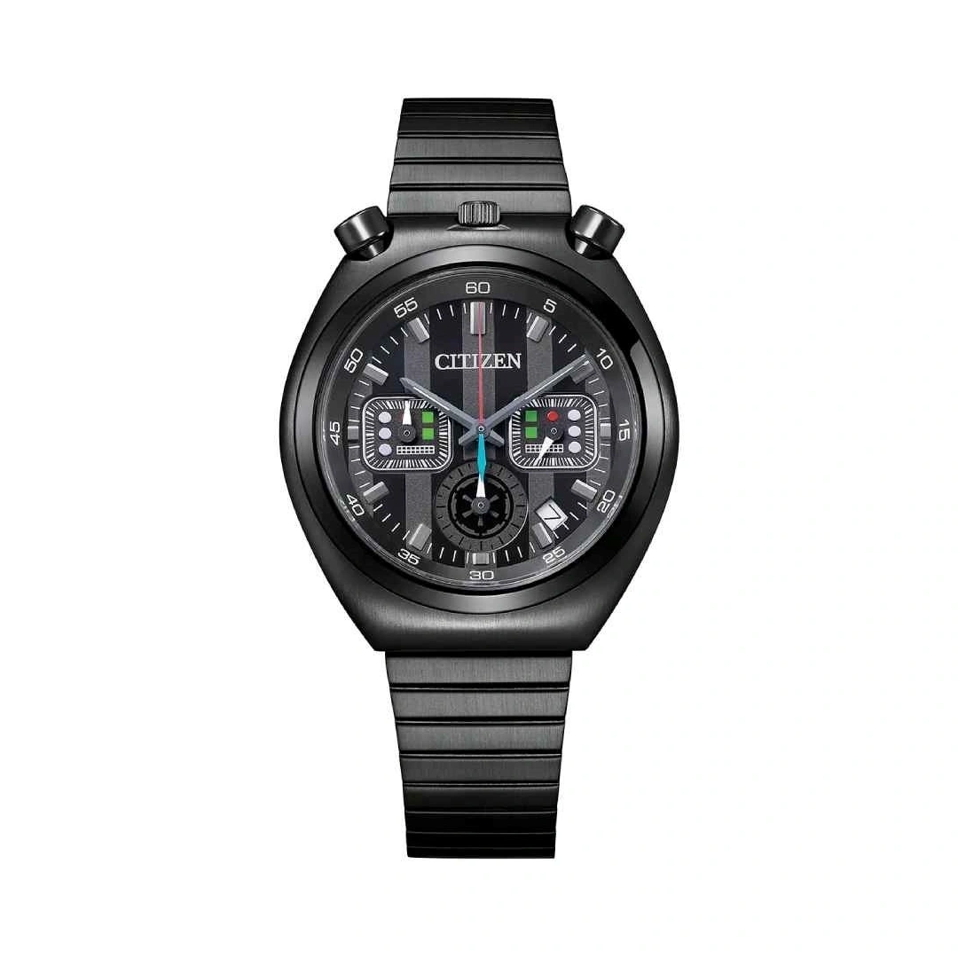 The Citizen AN3669-52E is a bold chronograph inspired by the iconic Sith Lord Darth Vader from the legendary Star Wars saga. Drawing design inspiration from Citizen’s classic 1972 Tsuno Chrono, the watch features the distinctive “horns” positioned beside the 12 o’clock area of the case. Its black ion-plated stainless steel case and bracelet complement the deep black dial, while the chronograph hands incorporate red and green accents symbolizing Darth Vader’s transformation from Jedi to Sith. The case back is engraved with the character design, enhancing the watch’s collectible appeal.