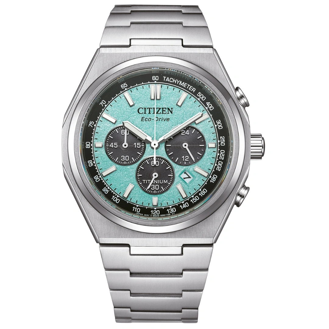The Citizen CA4610-85M is a sporty chronograph that blends advanced materials with Citizen’s innovative Eco-Drive technology. The watch features a 42.5 mm case and bracelet crafted from Super Titanium™, a proprietary material that is up to five times harder than stainless steel while being significantly lighter, providing exceptional durability and comfort. The Duratect TIC coating enhances scratch resistance and maintains the watch’s refined titanium finish.