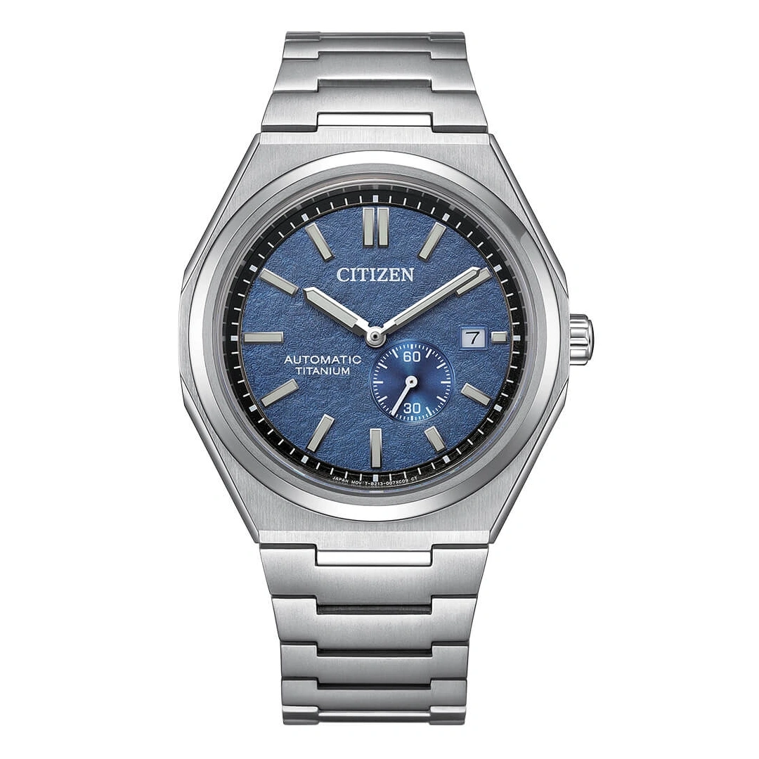 The Citizen Zenshin NJ0180-80L is a modern automatic timepiece that combines classic proportions with advanced materials and contemporary styling. Crafted from Citizen’s proprietary Super Titanium™, the 40.5 mm case and integrated bracelet are both lightweight and অত্যন্ত durable—being significantly harder and lighter than stainless steel while also resistant to scratches and rust. The textured blue dial is enhanced with a contrasting outer minute ring, luminous hands and markers, and a date window at 3 o’clock, while an off-center small seconds sub-dial adds a distinctive mechanical touch.