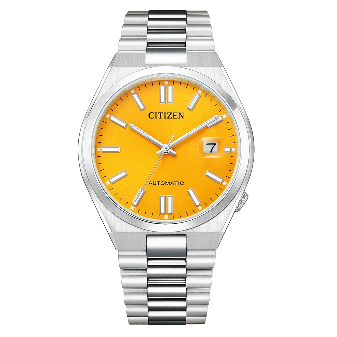 The Citizen TSUYOSA NJ0150-81Z is an automatic watch from the TSUYOSA NJ015 series, blending sporty aesthetics with everyday functionality. Its 40 mm silver-tone stainless steel case and integrated stainless steel bracelet give a modern and robust appearance. The sunray yellow dial adds vibrancy, featuring a date window at 3 o’clock, all protected beneath a scratch-resistant sapphire crystal.