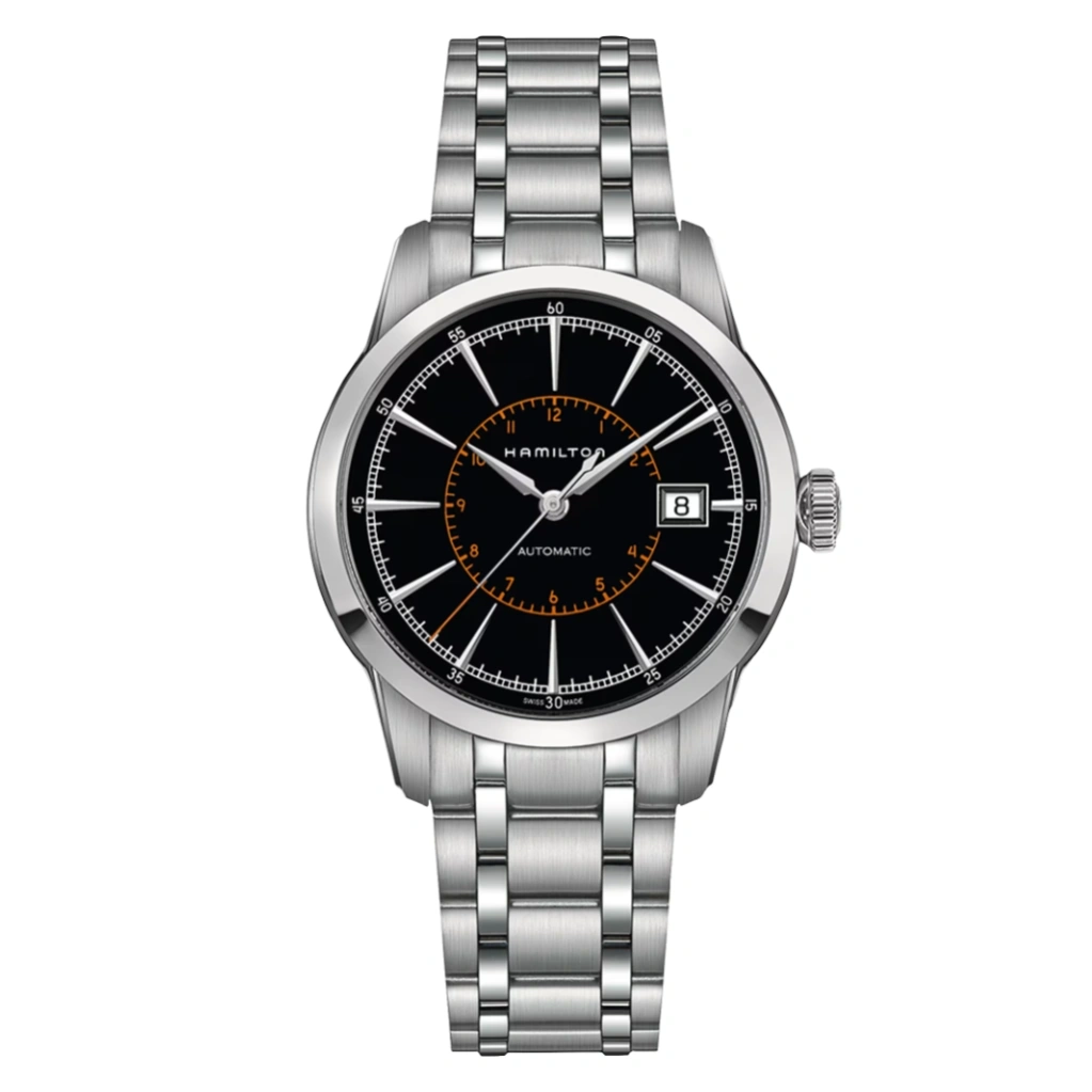 The Hamilton American Classic RailRoad Auto H40555131 is a timepiece inspired by the brand’s rich railroad heritage, combining precision-focused design with modern craftsmanship. Featuring a bold black dial, this model offers a highly legible three-hand layout with clear minute tracking, reflecting the historical importance of accuracy in railway timekeeping. The stainless steel case paired with a sapphire crystal with anti-reflective coating ensures durability and clarity, while the stainless steel bracelet with a folding clasp provides a secure and comfortable fit for everyday wear.