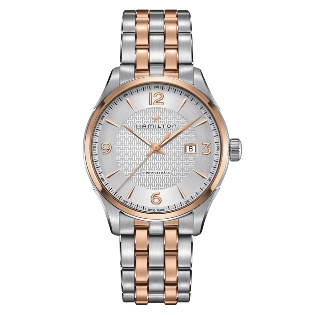 The Hamilton Jazzmaster Viewmatic Auto H42725151 is a bold and elegant timepiece that combines classic design with modern detailing. Featuring a refined silver dial, this model offers a clean three-hand layout with excellent legibility, enhanced by Super-LumiNova on the hands and markers. The stainless steel case with PVD rose coating adds a warm, luxurious tone, while the sapphire crystal with anti-reflective treatment ensures clarity and scratch resistance. Paired with a stainless steel bracelet and folding clasp, the watch delivers both durability and everyday comfort.