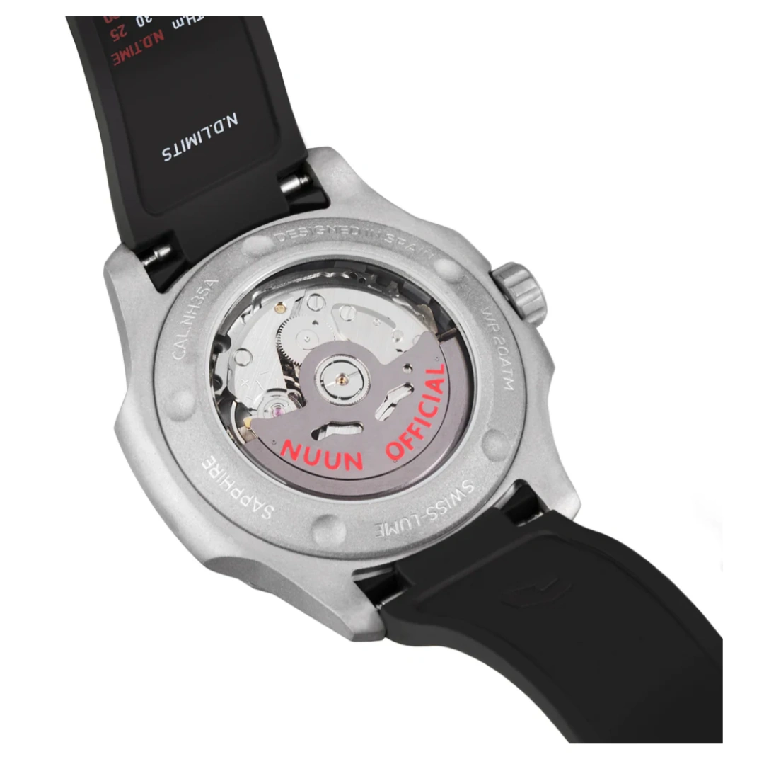 The Nuun N200 Titanium Gray v2 IN is a high-performance automatic dive watch that pairs minimalist aesthetics with rugged engineering. Crafted from Titanium Gray-coated 316L sandblasted stainless steel, this bold diver’s watch features a translucent dial with clean Index markers, offering a sleek, modern look. At its core lies the Seiko Cal. NH35A automatic movement, a reliable and widely respected engine in the world of mechanical watches.