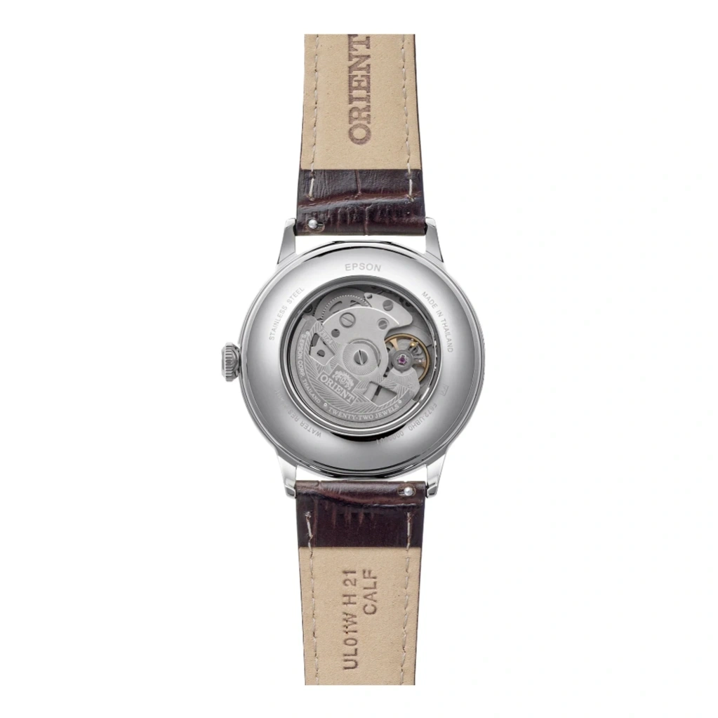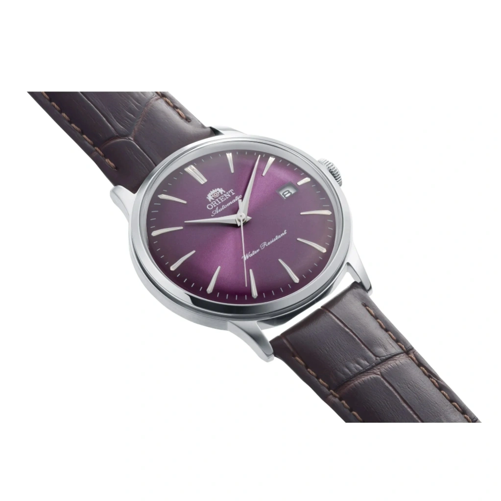 The Orient RA-AC0032V Classic & Simple Style watch stands out with its elegant purple gradation dial, offering a modern twist on a timeless dress watch design. The 40.5mm stainless steel case paired with a brown leather strap creates a refined and versatile look, suitable for both formal occasions and everyday wear. The exhibition case back adds a touch of sophistication by showcasing the mechanical movement inside.