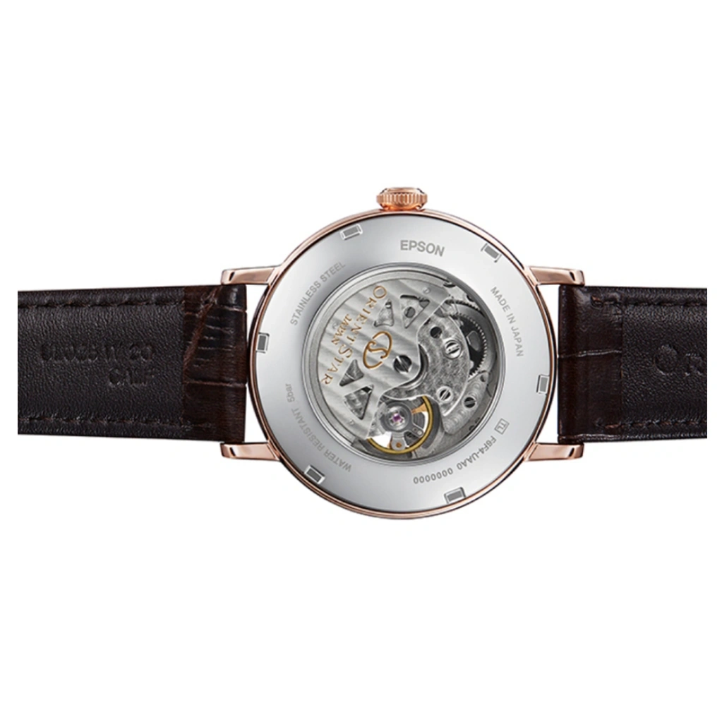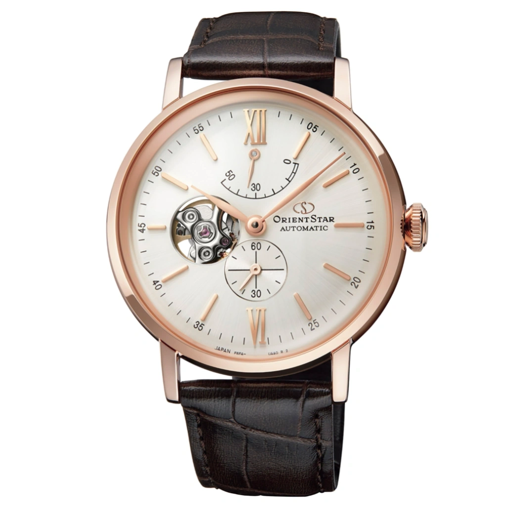The Orient Star Automatic RE-AV0001S00B is a stylish dress watch featuring a white open-heart dial that offers a view of the automatic movement. Rose gold-tone leaf-style hands, index markers, and Roman numerals at 6 and 12 o’clock enhance legibility and elegance. Two sub-dials display the small second and power reserve, while the fixed rose gold-tone bezel adds a refined touch.