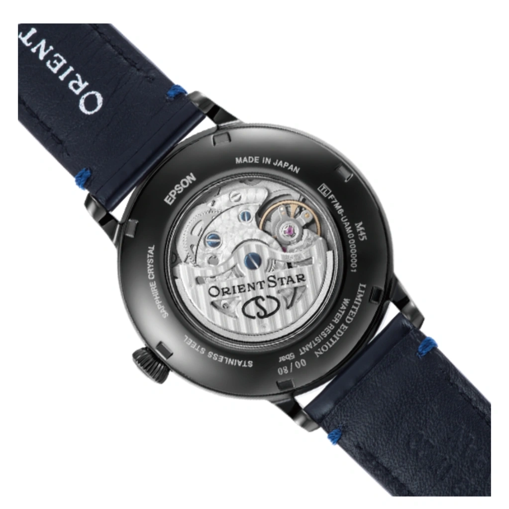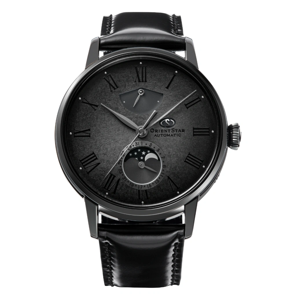 The Orient Star M45 F7 Mechanical Moon Phase RE-AY0124N is a cosmic-inspired limited-edition timepiece capturing the mystique of the M45 Pleiades star cluster. Its grey gradation dial, created with advanced stamping, painting, and thick clear coating techniques, evokes the depth of the night sky and the subtle twinkling of stars. A dual-plate structure displays the power reserve at 12 o’clock and the moon phase, date hand, and date display at 6 o’clock, while black Roman numerals and silver accents add refined contrast and legibility.
