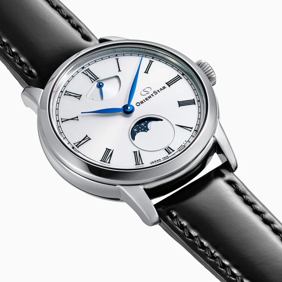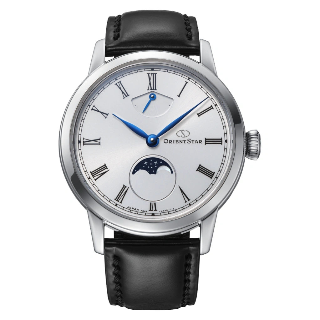 The Orient Star M45 F8 Mechanical Moon Phase Hand Winding RE-BW0004S is a sophisticated dress watch from the M45 Classic Collection, inspired by the calm beauty of the moonlit night. Its elegant white dial features a refined moon phase display crafted with a mother-of-pearl moon, complemented by a fine radial pattern and glossy finish that enhances its timeless aesthetic. The blue leaf-shaped hands stand out beautifully, adding a touch of classic luxury.