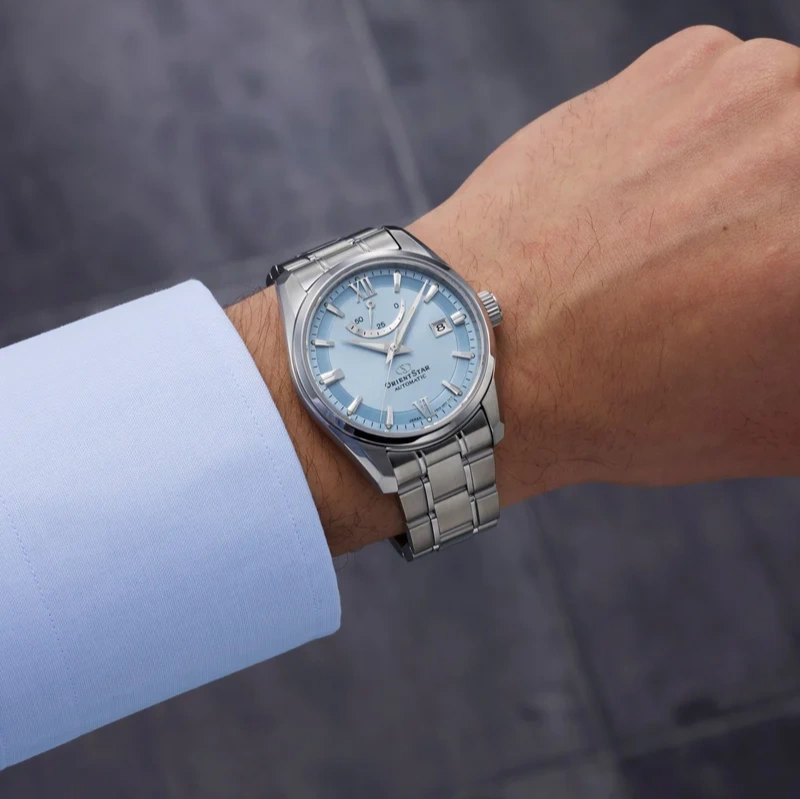 The Orient Star RE-AU0109L Contemporary Date watch blends classic elegance with modern functionality. Featuring a beautifully nuanced ice-blue dial, it offers a central time display, a date indicator at 3 o’clock, and Orient Star’s signature power reserve indicator at 12 o’clock. Designed for versatility, this model suits both business and casual settings, while the stainless steel case and flat sapphire crystal ensure durability and clarity.