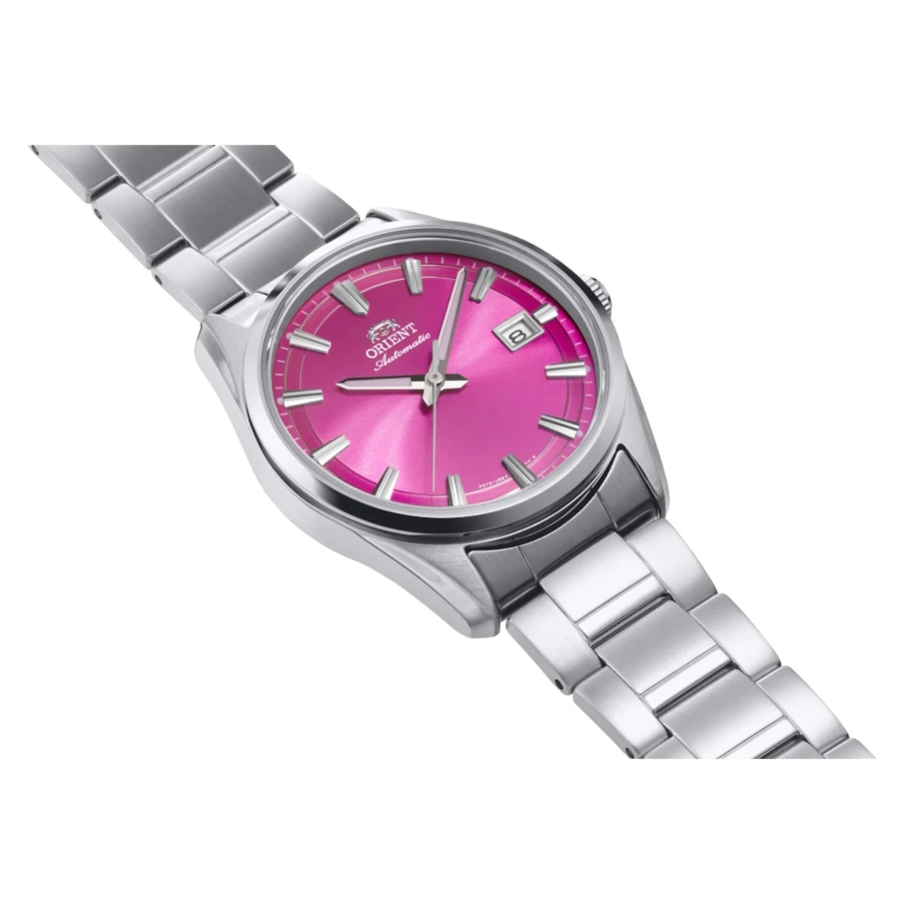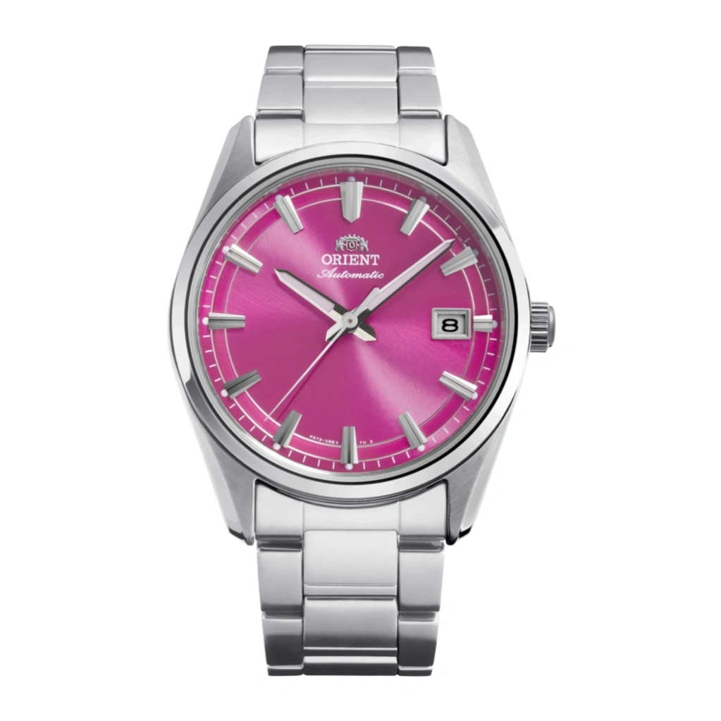 The Orient Stretto Date RA-AC0R07P stands out with its unique pink dial, offering a fresh and modern twist on classic mechanical watch design. Paired with a stainless steel bracelet and a 38.5mm case, it delivers a balanced and elegant look suitable for both everyday wear and more refined occasions. The exhibition case back adds a sophisticated detail, allowing a view of the mechanical movement inside.