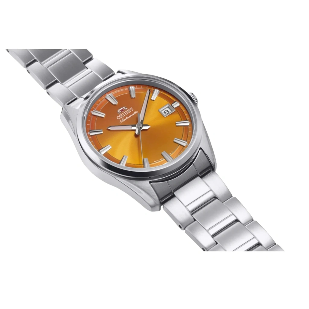 The Orient Stretto Date RA-AC0R08Y brings a bold and vibrant touch to classic mechanical watch design with its striking orange dial. Paired with a stainless steel bracelet and a well-balanced 38.5mm case, it offers a unique yet refined look that stands out while remaining suitable for everyday wear. The exhibition case back adds an extra layer of sophistication by revealing the intricate movement within.