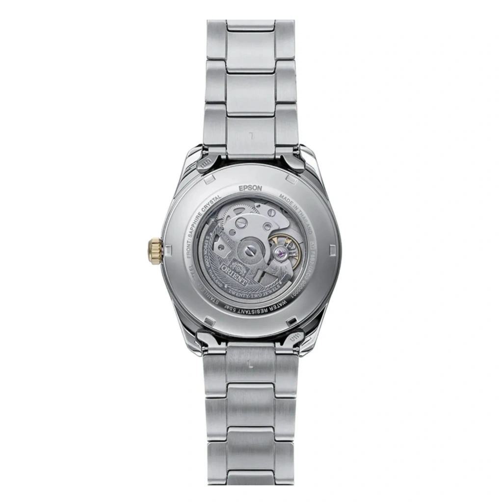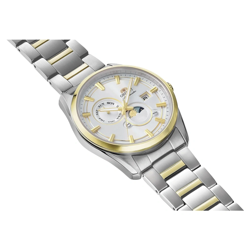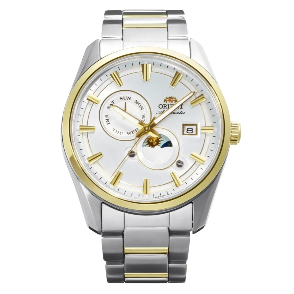 The Orient Stretto Day & Night RA-AK0312S combines elegant design with functional complications, featuring a clean white dial accented by a gold-tone bezel. Its 41.5mm stainless steel case paired with a matching bracelet creates a refined yet bold presence on the wrist, suitable for both formal and everyday wear. The exhibition case back adds a premium touch by showcasing the intricate mechanical movement inside.