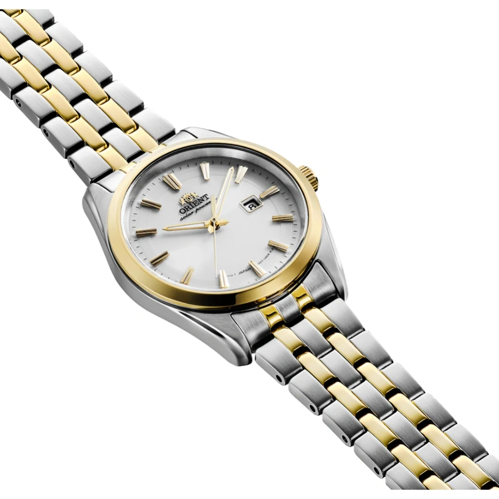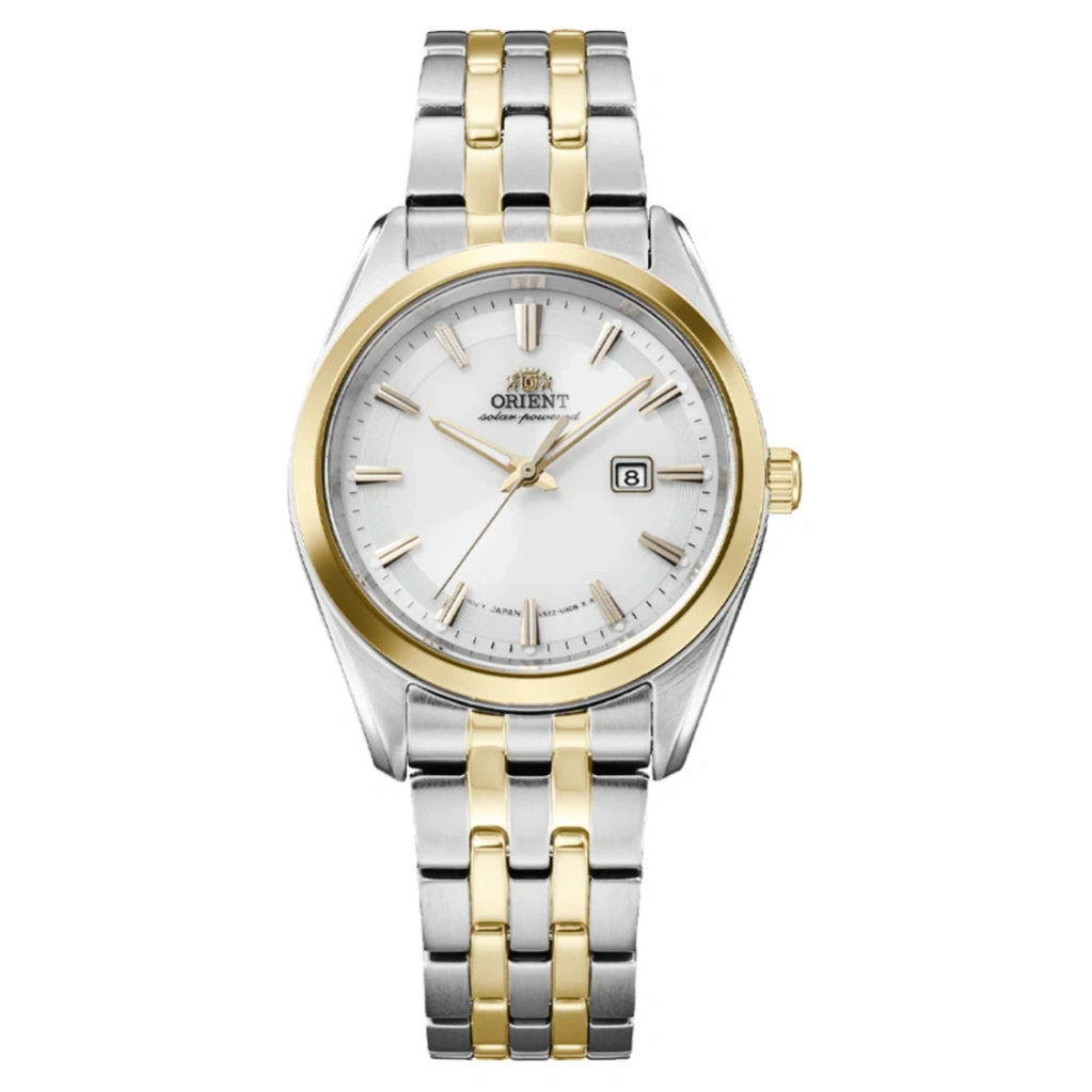 The Orient Stretto RA-WG0601S is a sleek solar-powered watch designed for elegance and practicality. Its white dial, gold-coloured bezel, and luminous hands provide excellent readability, while the slim 32.1mm case ensures a refined, comfortable fit for smaller wrists.