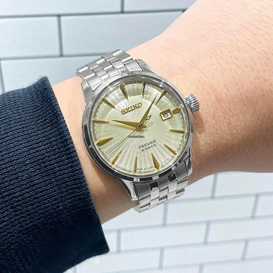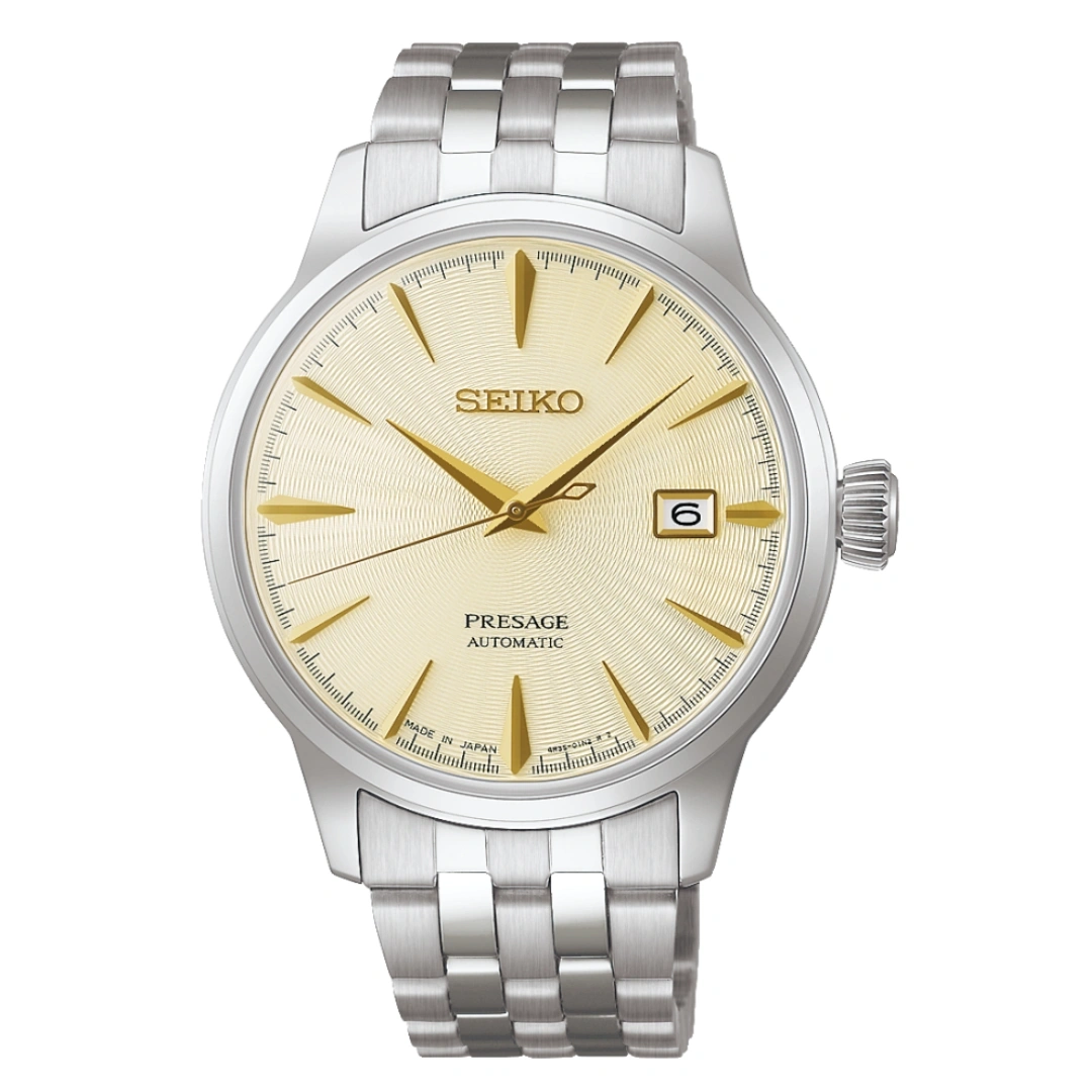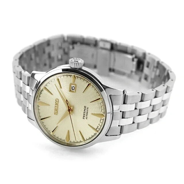 The Seiko Presage Cocktail Time SARY273 is a sophisticated men’s watch from Seiko’s Presage collection, designed for those who appreciate classic elegance and reliable performance. Featuring a beige analog dial with a date display, this timepiece is powered by Seiko’s automatic 4R35 movement and is antimagnetic, ensuring precise timekeeping even in magnetic environments. Its stainless steel round case measures 40.5 mm in diameter and 11.8 mm in thickness, protected by a Hardlex crystal, giving it both durability and a polished, refined look.